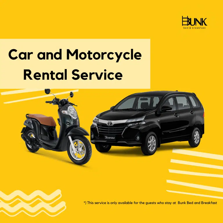 Guests can rent motorcycle or car directly to our receptionist during their stay. The surcharge for this service is per day per motorcycle unit and per 12 hours per car unit.